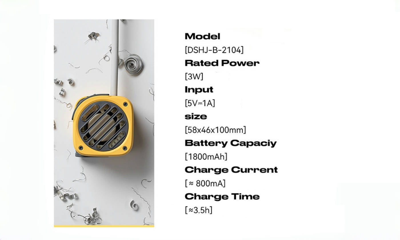 A brushless motor and turbine duct deliver focused wind with low noise; the 1800mAh cell runs 3–6 hours per charge.