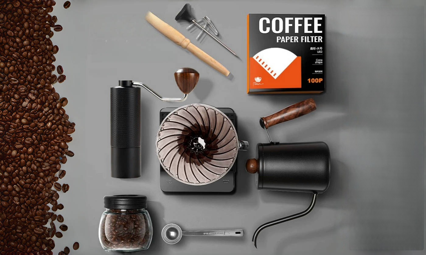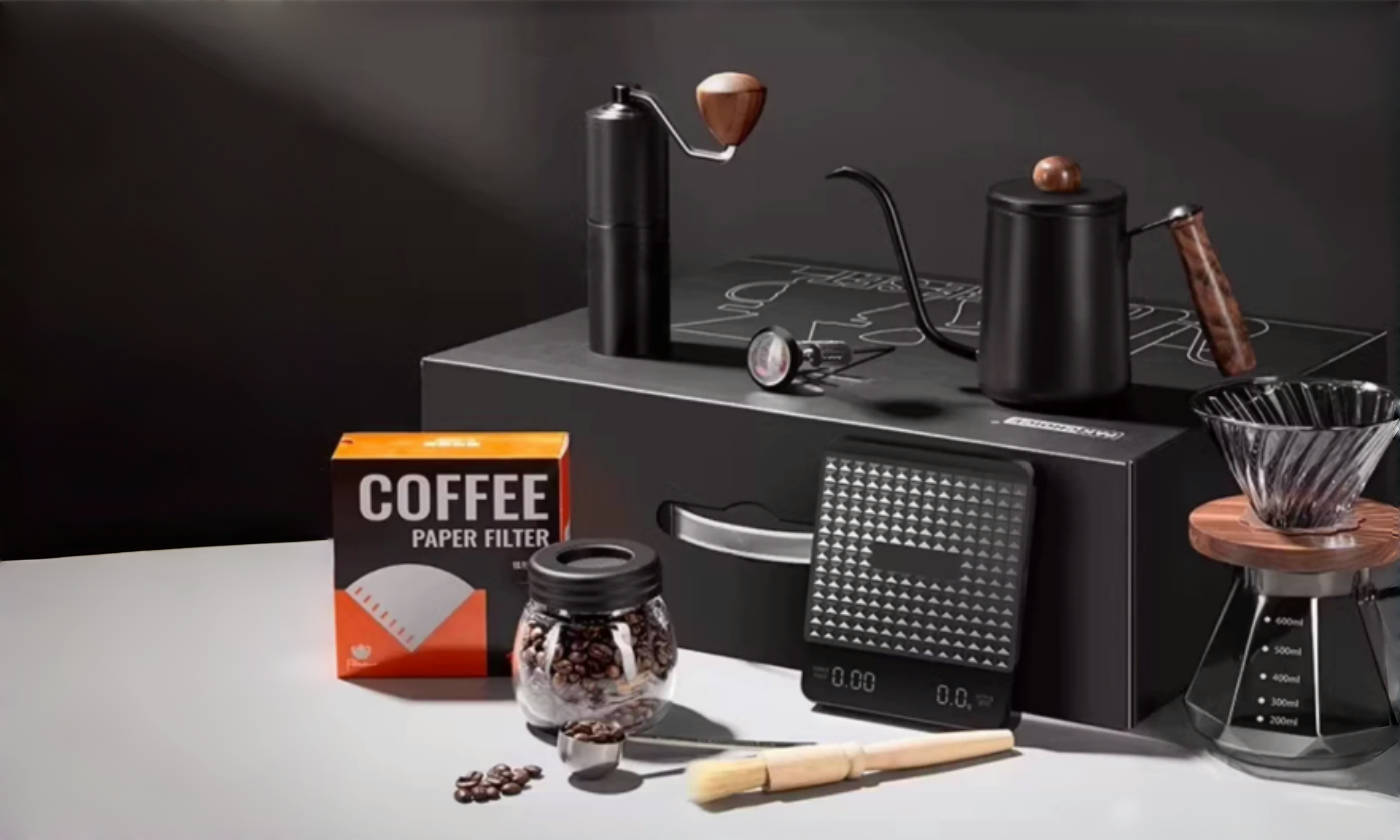 Dual-bearing grinder (420 SS burrs), 0.1 g timer scale, and wood-pulp filters complete the workflow—gift it today, dial in delicious tomorrow.