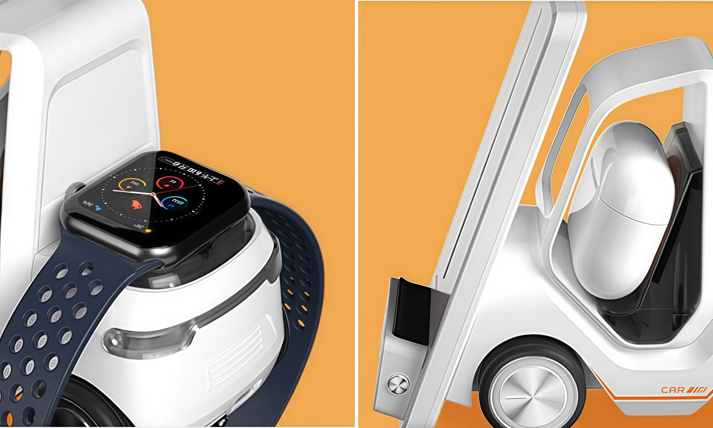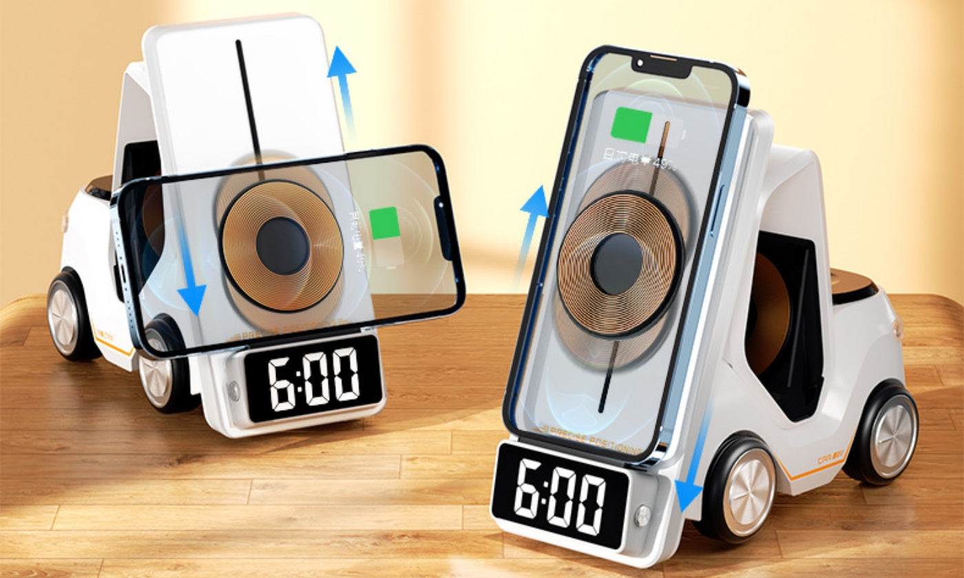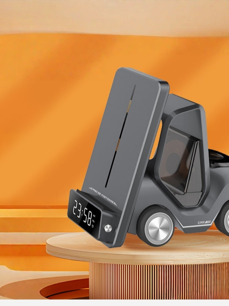 Power three devices at once—phone (15W), watch (2.5W), and earbuds (5W)—on a sleek, car-inspired desk stand that doubles as a bedside clock and ambient light....
