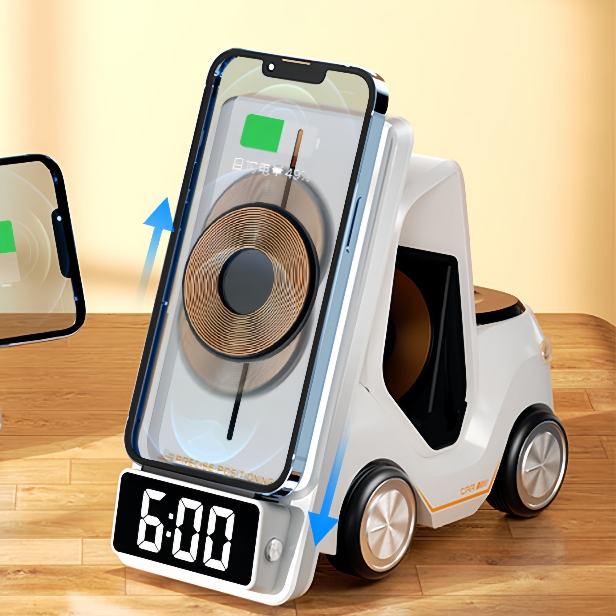 Power three devices at once—phone (15W), watch (2.5W), and earbuds (5W)—on a sleek, car-inspired desk stand that doubles as a bedside clock and ambient light. Smart coil height, Mag-assist alignment, and ninefold safety keep charging fast, tidy, and secure.