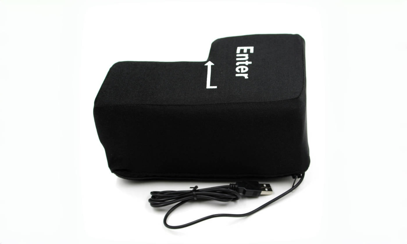 Smash stress and hit “Enter” for real. This oversized USB button is recognized as an Enter key on most computers, with a plush foam core and washable cover. Pound away, then flip it for a quick desk nap pillow. Perfect for fun desks, gamers, and stress relief.