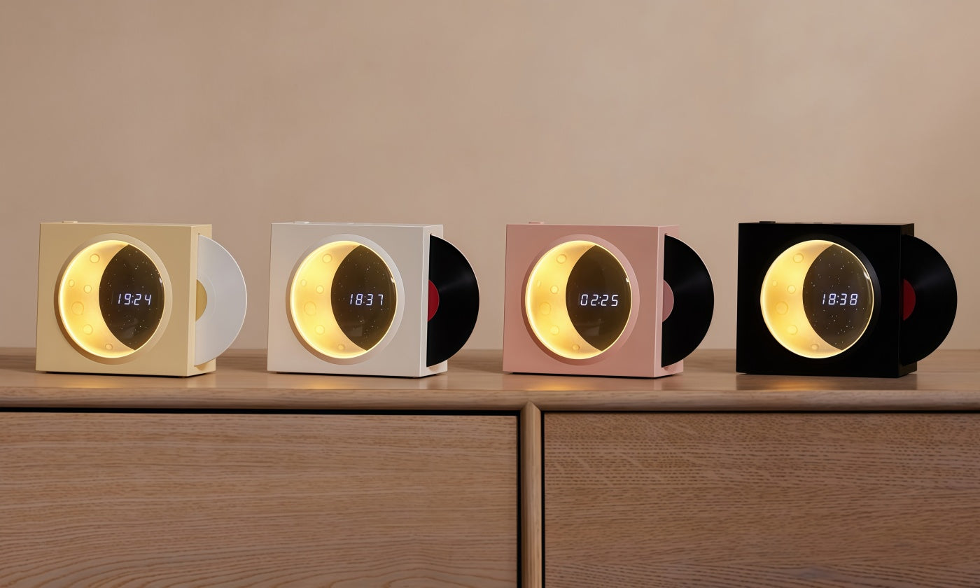A spinning “vinyl” platter and half-moon glow turn every track into a mini ritual—retro charm with modern convenience.