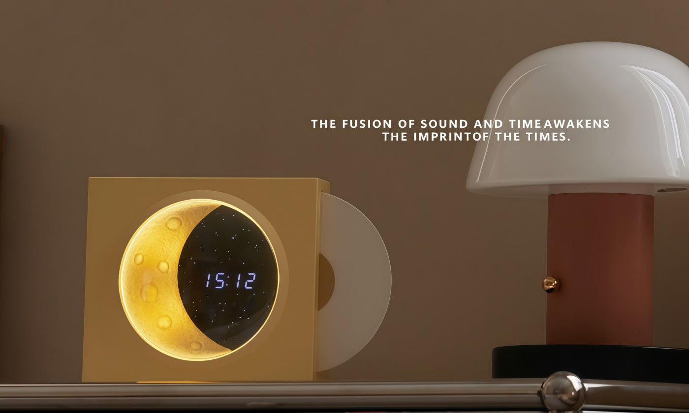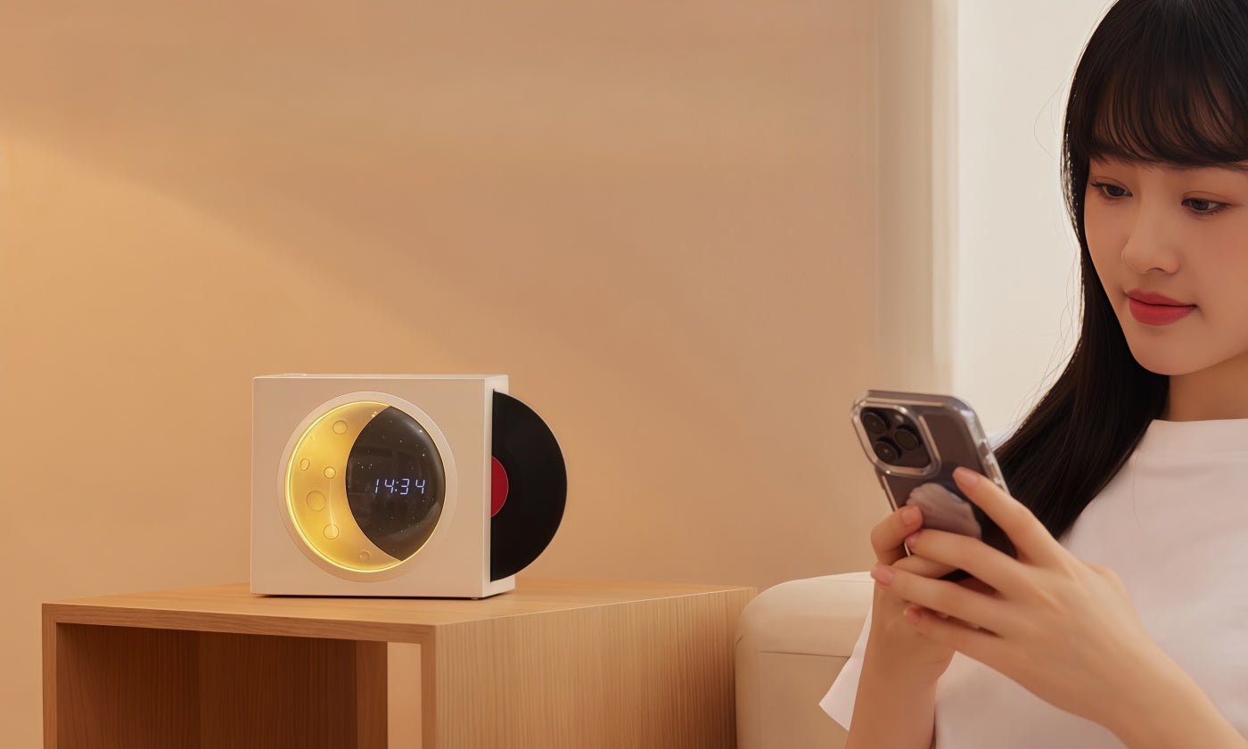 A retro-modern speaker that spins a “vinyl” disc as music plays. BT 5.3 ensures quick, stable links; TF/AUX add flexibility. With a phone-synced clock and warm moonlight glow, it’s immersive Hi-Fi and timeless décor in one compact unit.